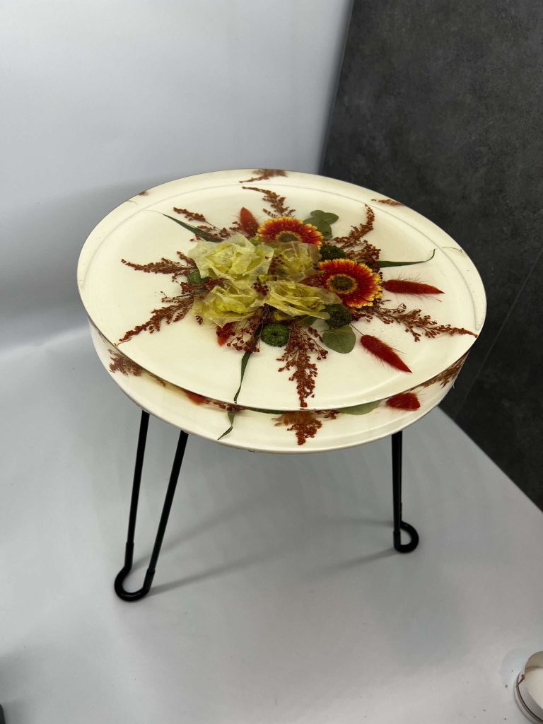 Terwijl jullie werken aan het boeket, werk ik verder aan de tafel. Dit is een langdurig en technisch proces dat absolute precisie vereist. Gedroogde bloemen geven na het besproeien met hars luchtbellen af. Deze moeten continu worden gecontroleerd en verwijderd, zodat ze niet zichtbaar blijven in de tafel. Dit vraagt tijd, ervaring en volledige aandacht.